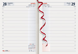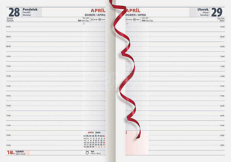 Denný diár v pestrej farebnej škále vo formáte A5 s bohatým obsahom. Kvalitný diár s hodinovým delením (7:00 - 19:00) obsahuje slovenské a české kalendárium, anglický preklad mesiacov a dní, informácie o štátnych sviatkoch všetkých krajín EÚ, prehľadný a plánovací kalendár (fond pracovného času), školské prázdniny, adresár. Ponúka dostatočný priestor pre písanie poznámok a pripomienok.