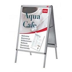 Rám na zobrazovanie informácií, plagátov alebo propagačných ponúk do interiéru aj exteriéru. Mechanizmus otvárania na klip, antireflexná fólia z PVC na ochranu pred špinou a prachom, vkusný hliníkový rám s tmavosivými rohovými spojkami. Verzia „A“ so stojanom. Formát A2. Rozmery v × š × h : 850 × 485 × 475 mm.| Vlastnosti produktu | |