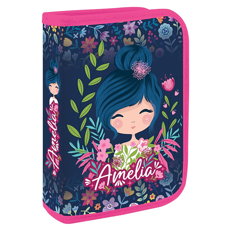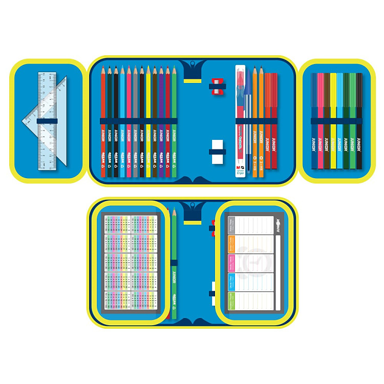 Plný peračník s 1 zipsom a 2 chlopňami, vnútorná podšívka: farebná. Obsahuje 31 dielov: 14 fixiek, 8 šesťhranných farbičiek, 2 šesťhranné ceruzky, strúhadlo, gumu, 16 cm pravítko, trojuholník, guľôčkové pero, rozvrh hodín a vizitku.