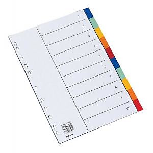 10-dielny A4 plastový farebný rozraďovač bez označenia s eurodierovaním a titulným listom na popisovanie obsahu. Balenie jedna sada v polyesterovom sáčku. Väčšie balenie 25 sád.| Vlastnosti produktu | |