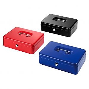 Uzamykateľná pokladnička so zaoblenými rohmi a odnímateľným zásobníkom. Rozmery 200 × 148 × 70 mm.