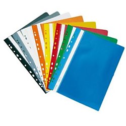 Obal s eurodierovaním z kvalitného polypropylénu na uloženie dierovaných dokumentov do formátu A4. Predná strana priehľadná lesklá, biely papierový zasúvací štítok pozdĺž chrbta. Rozmery 310 × 235 mm.