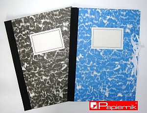 Jednostranne poťahované kartónové dosky s chrbtom zo strojnej lepenky, spojené šnúrkami. Formát A3. Prevedenie mramor.